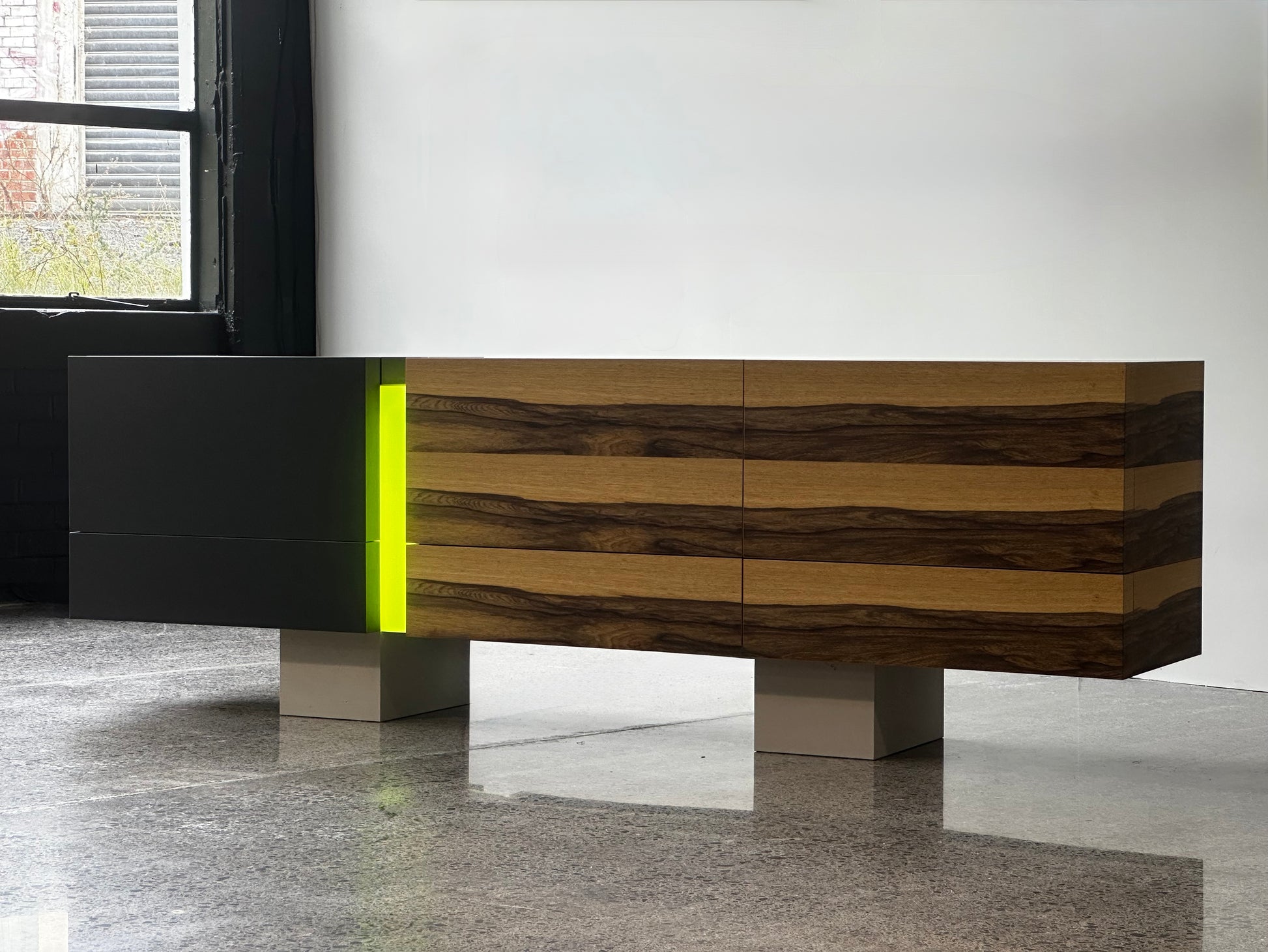 Material: Furniture Linoleum & African Walnut Veneer, slip matched, with a Perspex light box.